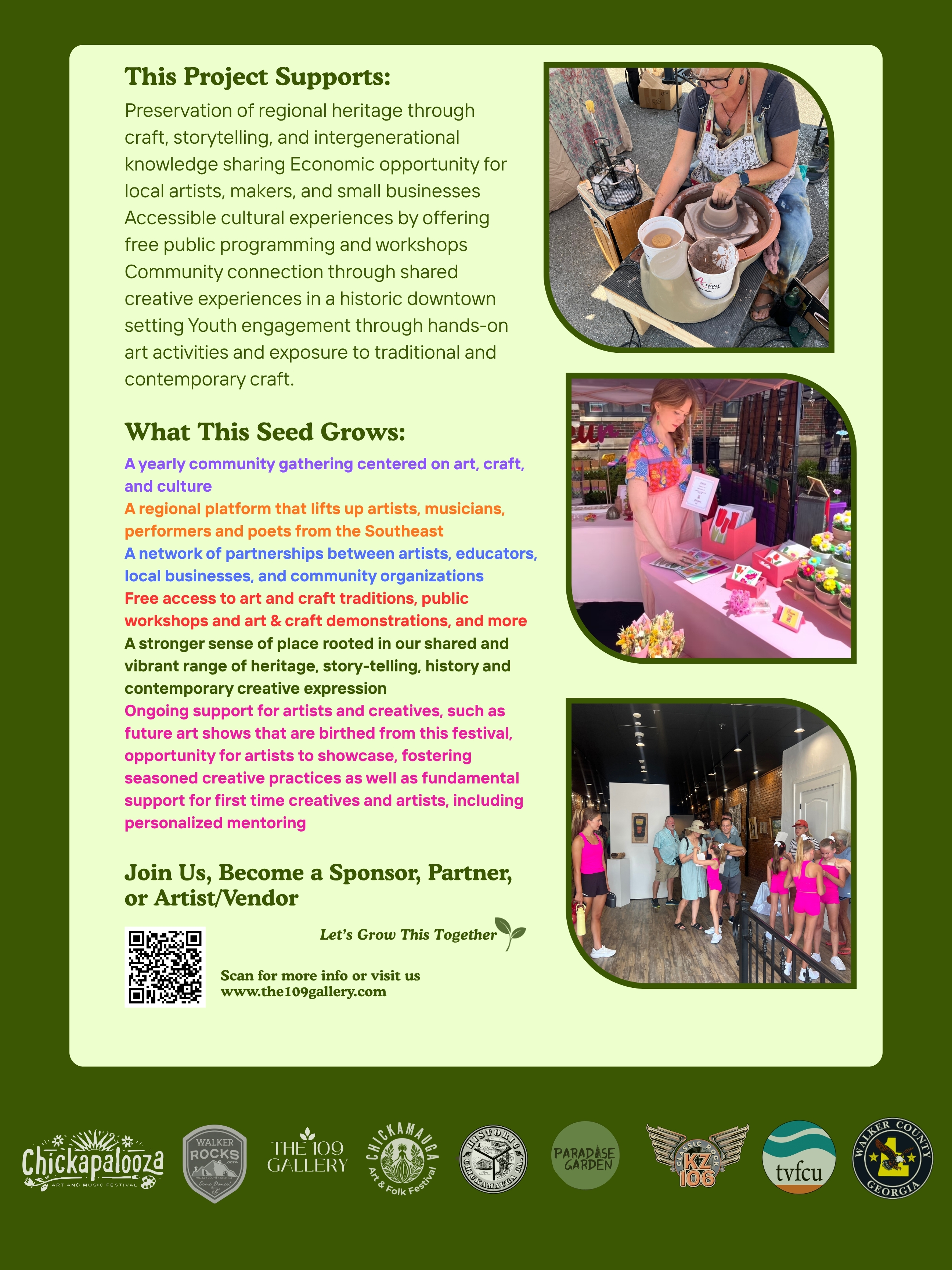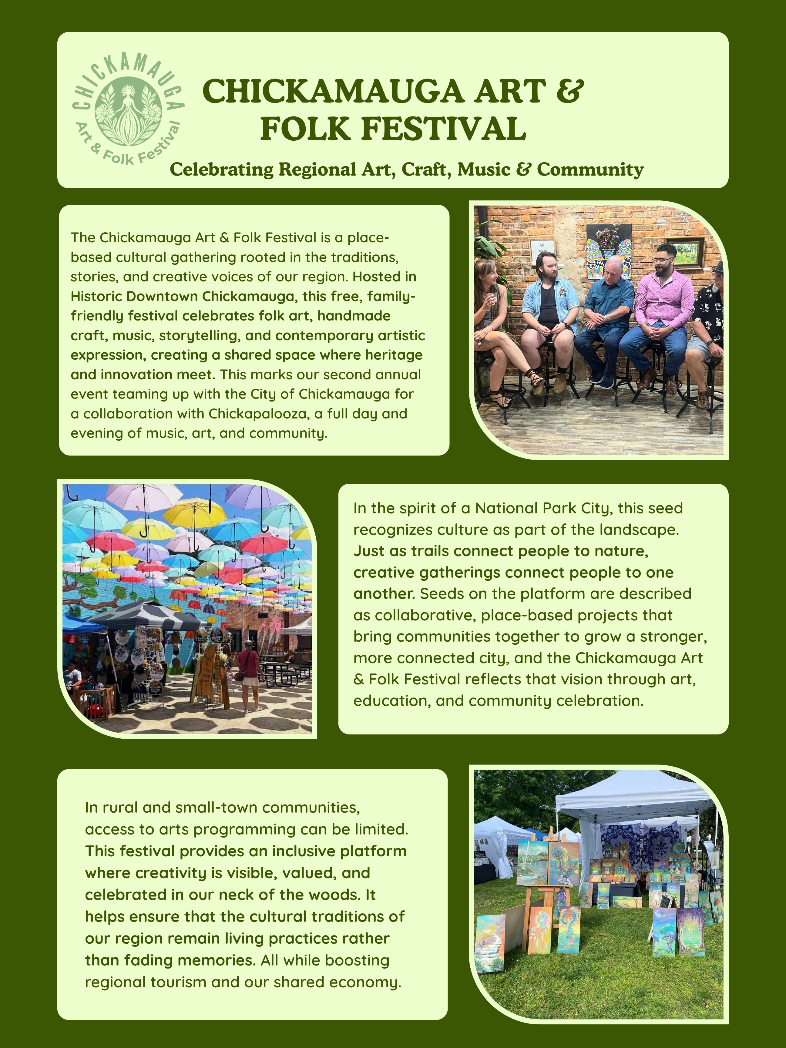 Like many grassroots community events, the Chickamauga Art & Folk Festival operates with limited financial and staffing resources. The primary challenges are not a lack of community interest, but the practical realities of sustaining a free public event in a small-town setting. Common obstacles include: Limited funding for infrastructure and artist support Reliance on volunteers and small teams to manage logistics Weather-related risks for outdoor events Balancing growth with the capacity of available resources Ensuring consistent promotion and outreach in a rural region Maintaining accessibility while managing operational costs Despite these challenges, the festival continues to grow through strong community relationships, local partnerships, and a shared commitment to celebrating the creative voices of the region.