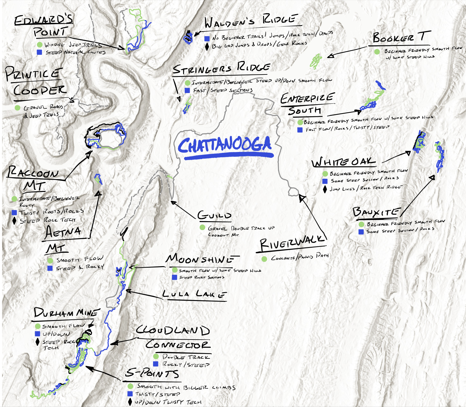 This system is organized around the Riverwalk corridor, with several high-potential anchor sites that can scale over time. An ideal first step is a pilot site along the Riverwalk at 35.02197584610327, -85.32287413054752. This location offers a highly accessible, city-owned opportunity to quickly demonstrate impact through natural-surface trails and an entry-level pump track, with room to expand into more advanced features. It is a low-barrier, high-visibility starting point that can build momentum for the broader vision. Potential locations for a larger, destination-style bike park include: - Hill behind Siskin Steel along the Riverwalk (35.03402557086562, -85.32362444263393) This site has exceptional potential, with ideal topography, direct Riverwalk access, and enough space to support a world-class bike park. Land ownership presents a challenge, but the upside is significant. - Walden’s Ridge Lower Trailhead (35.134992532579716, -85.3064626754292) This location offers a unique opportunity to connect directly into an existing trail system from a primary access point—similar to the model seen in Baker Creek Preserve. Land ownership is a challenge, but the connectivity is unmatched. - White Oak Park (City of Red Bank) A strong candidate due to its available space, favorable terrain, and proximity to Stringers Ridge. While it sits outside Chattanooga city limits, it presents an opportunity for regional collaboration to expand the reach and impact of the system.